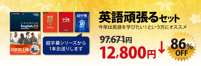 【福袋】ソースネクスト福袋発売中!! コメントを残す 2017年になり、何かに頑張ろうと決める方も多いかと思いますが、管理人は今年こそ、英語を頑張ろうと思っています。 そんなわけで、リーダーズ・ダイジェスト English20を購入してみました。 今なら、英語頑張るセットということで、86%OFFになっているので、いかがでしょうか。 また、その他、ノートPCセット(44,000円)やタブレットセット(10,000円)等、10種類の福袋を発売中です。 限定数かぎりなので、お早めに!!